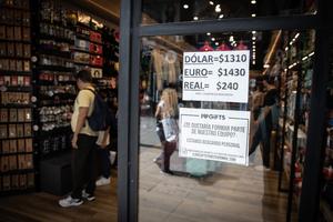 (250327) -- BUENOS AIRES, 27 marzo, 2025 (Xinhua) -- Un cartel indica la cotización del dólar paralelo en un local...