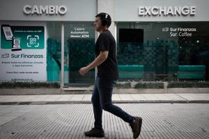 (250327) -- BUENOS AIRES, 27 marzo, 2025 (Xinhua) -- Un hombre camina frente a un local de venta de divisas...