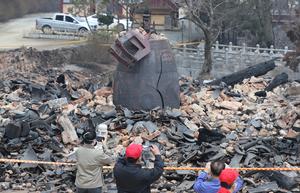 (250327) -- GYEONGSANG, 27 marzo, 2025 (Xinhua) -- Imagen del 27 de marzo de 2025 de un antiguo templo destruido...