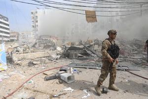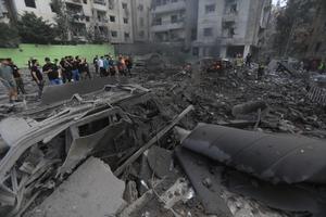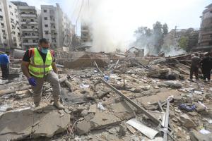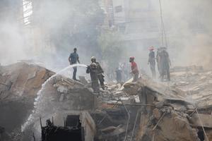(250328) -- BEIRUT, 28 marzo, 2025 (Xinhua) -- Bomberos trabajan en el sitio donde un edificio fue destruido por ataques...