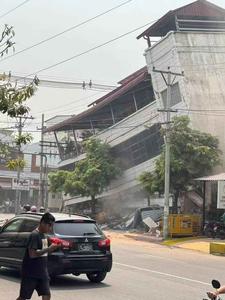 (250328) -- MANDALAY, 28 marzo, 2025 (Xinhua) -- Imagen del 28 de marzo de 2025 de un edificio dañado después...
