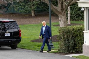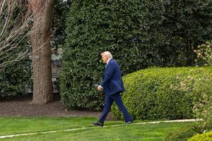 (250328) -- WASHINGTON, 28 marzo, 2025 (Xinhua) -- El presidente estadounidense, Donald Trump, camina en el Jardín Sur para abordar...