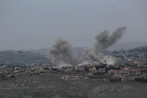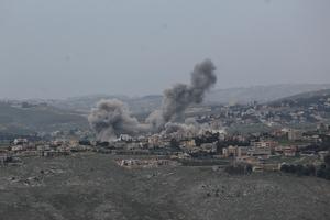 (250328) -- KFAR TEBNIT, 28 marzo, 2025 (Xinhua) -- Humo se eleva después de un bombardeo de artillería israelí, en...