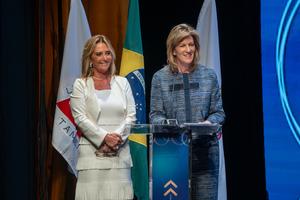 (250328) -- BELO HORIZONTE, 28 marzo, 2025 (Xinhua) -- Imagen del 26 de marzo de 2025 de panelistas participando en...