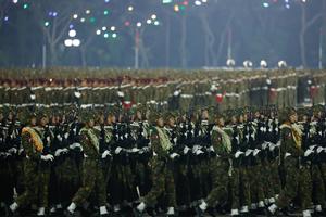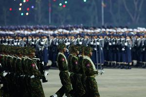 (250328) -- NAY PYI TAW, 28 marzo, 2025 (Xinhua) -- Imagen del 27 de marzo de 2025 de soldados marchando...
