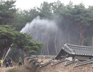 (250328) -- ANDONG, 28 marzo, 2025 (Xinhua) -- Bomberos realizan labores de prevención de incendios en los alrededores de la...