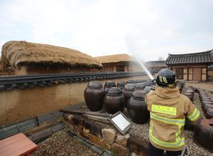 (250328) -- ANDONG, 28 marzo, 2025 (Xinhua) -- Un bombero realiza labores de prevención de incendios en la Aldea Tradicional...