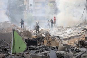 (250328) -- BEIRUT, 28 marzo, 2025 (Xinhua) -- Bomberos trabajan en el sitio donde un edificio fue destruido por ataques...