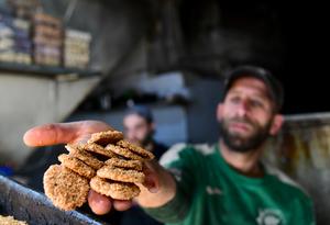 (250328) -- DAMASCO, 28 marzo, 2025 (Xinhua) -- Imagen del 27 de marzo de 2025 de un hombre mostrando galletas...