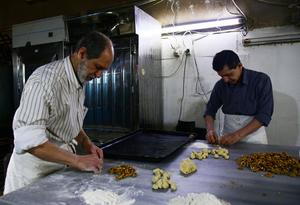 (250328) -- DAMASCO, 28 marzo, 2025 (Xinhua) -- Imagen del 27 de marzo de 2025 de dos panaderos sirios preparando...