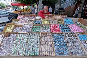 (250328) -- BEIRUT, 28 marzo, 2025 (Xinhua) -- Un vendedor ofrece dulces tradicionales en su puesto previo al Eid al-Fitr,...