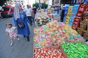 (250328) -- BEIRUT, 28 marzo, 2025 (Xinhua) -- Personas caminan junto a puestos de dulces previo al Eid al-Fitr, en...