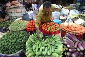 (250228) -- DHAKA, 28 febrero, 2025 (Xinhua) -- Imagen del 27 de febrero de 2025 de un vendedor acomodando verduras...
