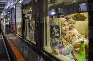 (250328) -- BANDUNG, 28 marzo, 2025 (Xinhua) -- Pasajeros esperan en un tren previo al próximo Eid al-Fitr en la...