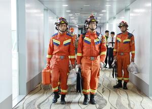 (250329) -- YANGON, 29 marzo, 2025 (Xinhua) -- Rescatistas chinos llegan al Aeropuerto Internacional de Yangón, en Yangón, Myanmar, el...