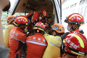(250331) -- MANDALAY, 31 marzo, 2025 (Xinhua) -- Rescatistas chinos transfieren a un sobreviviente en el sitio de un terremoto,...
