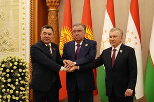 (250331) -- KHUJAND, 31 marzo, 2025 (Xinhua) -- El presidente tayiko, Emomali Rahmon (c), el presidente kirguís, Sadyr Japarov (i),...