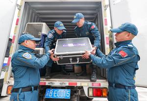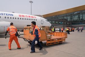 (250330) -- KUNMING, 30 marzo, 2025 (Xinhua) -- Empleados transportan materiales de socorro en el Aeropuerto Internacional Changshui de Kunming,...
