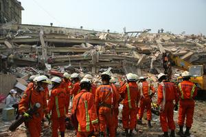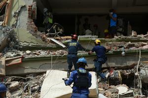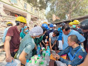 (250330) -- MANDALAY, 30 marzo, 2025 (Xinhua) -- Rescatistas se preparan para llevar a cabo operaciones de búsqueda y rescate...