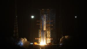 (250330) -- WENCHANG, 30 marzo, 2025 (Xinhua) -- Un cohete Gran Marcha-7A que transporta un nuevo satélite de prueba de...