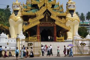 (250330) -- YANGON, 30 marzo, 2025 (Xinhua) -- Personas visitan la Pagoda Shwedagon, en Yangón, Myanmar, el 30 de marzo...