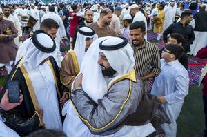 (250330) -- DOHA, 30 marzo, 2025 (Xinhua) -- Personas se saludan después de realizar la oración matutina del Eid al-Fitr...