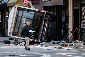 (250401) -- BOSTON, 1 abril, 2025 (Xinhua) -- Un oficial de policía trabaja en el sitio del accidente de un camión de carga, en Boston, Massachusetts, Estados Unidos, el 1 de abril de 2025. Un camión de carga atropelló a varios peatones y se estrelló contra un edificio en el centro de Boston el martes por la tarde. (Xinhua/Ziyu Julian Zhu) (oa) (ah) (vf)