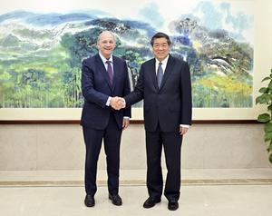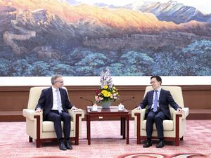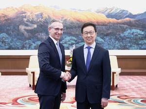 (250401) -- BEIJING, 1 abril, 2025 (Xinhua) -- El vicepresidente chino, Han Zheng, se reúne con Roy Jakobs, director ejecutivo...