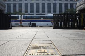 (250401) -- SEUL, 1 abril, 2025 (Xinhua) -- Un oficial de policía camina frente a la puerta del Tribunal Constitucional,...