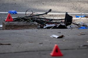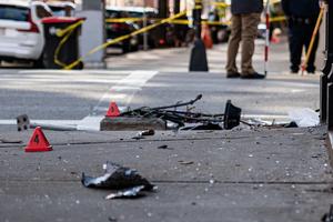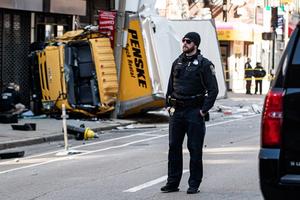 (250401) -- BOSTON, 1 abril, 2025 (Xinhua) -- Un oficial de policía trabaja en el sitio del accidente de un...