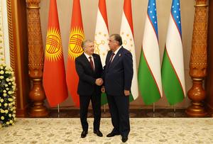 (250331) -- KHUJAND, 31 marzo, 2025 (Xinhua) -- El presidente tayiko, Emomali Rahmon (c), estrecha la mano del presidente uzbeko,...