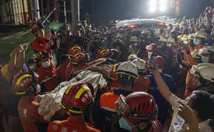 (250331) -- MANDALAY, 31 marzo, 2025 (Xinhua) -- Miembros del Equipo de Búsqueda y Rescate de China transfieren a una...