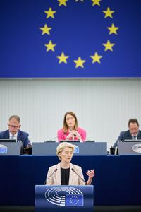 (250401) -- ESTRASBURGO, 1 abril, 2025 (Xinhua) -- La presidenta de la Comisión Europea, Ursula von der Leyen, pronuncia un...
