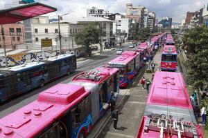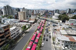 (250401) -- QUITO, 1 abril, 2025 (Xinhua) -- Vista aérea del 31 de marzo de 2025 de autobuses chinos de...