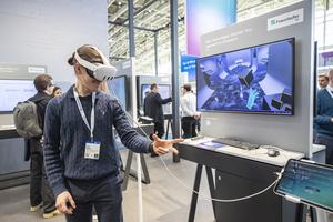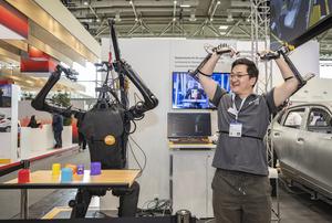 (250401) -- HANNOVER, 1 abril, 2025 (Xinhua) -- Imagen del 31 de marzo de 2025 de un expositor controlando un...