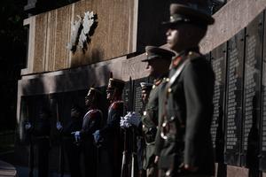 (250402) -- BUENOS AIRES, 2 abril, 2025 (Xinhua) -- Miembros de las distintas Fuerzas Armadas argentinas custodian el cenotafio durante...