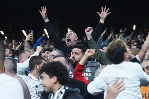 (250402) -- MADRID, 2 abril, 2025 (Xinhua) -- Imagen del 1 de abril de 2025 de aficionados de Real Madrid...