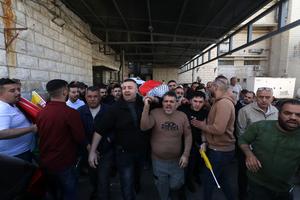 (250402) -- NAPLUSA, 2 abril, 2025 (Xinhua) -- Personas trasladan el cuerpo del palestino Hamza Muhammad Saeed Khammash durante su...