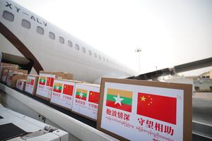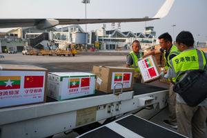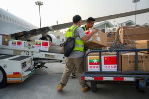 (250402) -- DEHONG, 2 abril, 2025 (Xinhua) -- Imagen del 1 de abril de 2025 de trabajadores cargando suministros médicos...