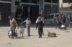 (250402) -- GAZA, 2 abril, 2025 (Xinhua) -- Palestinos tiran de carros con bolsas de harina en el barrio de...