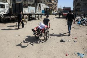 (250402) -- GAZA, 2 abril, 2025 (Xinhua) -- Un niño palestino utiliza una silla de ruedas para trasladar bolsas de...