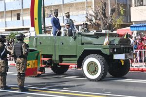 (250404) -- DAKAR, 4 abril, 2025 (Xinhua) -- El presidente senegalés, Bassirou Diomaye Faye, asiste a un desfile militar, en...