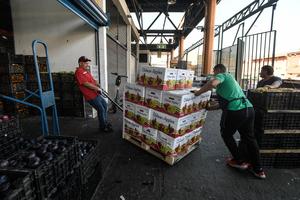 (250404) -- SANTIAGO, 4 abril, 2025 (Xinhua) -- Trabajadores empujan cajas de manzanas en el mercado La Vega Central, en...
