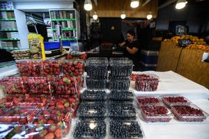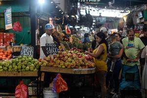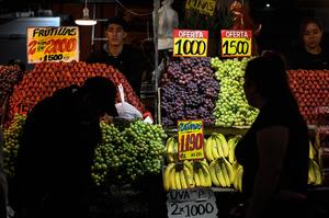(250404) -- SANTIAGO, 4 abril, 2025 (Xinhua) -- Una mujer compra manzanas en el mercado La Vega Central, en Santiago,...