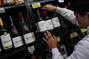 (250404) -- SANTIAGO, 4 abril, 2025 (Xinhua) -- Un vendedor acomoda una botella de vino en una tienda, en Santiago,...