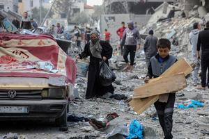 (250404) -- GAZA, 4 abril, 2025 (Xinhua) -- Personas son vistas en una escuela convertida en refugio después de un...