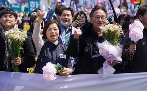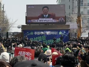 (250404) -- SEUL, 4 abril, 2025 (Xinhua) -- Personas reaccionan al fallo sobre el juicio por destitución del presidente Yoon...