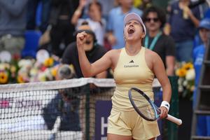 (250405) -- BOGOTA, 5 abril, 2025 (Xinhua) -- Camila Osorio festeja al término del partido de semifinal de sencillos entre...
