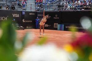 (250405) -- BOGOTA, 5 abril, 2025 (Xinhua) -- Camila Osorio sirve la pelota durante el partido de semifinal de sencillos...