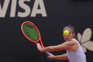 (250405) -- BOGOTA, 5 abril, 2025 (Xinhua) -- Julia Riera devuelve la pelota durante el partido de semifinal de sencillos...